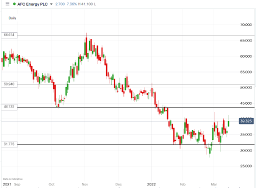 AFC Energy shares have fallen 22% this year but seem to be making a comeback. The 40p level offers significant resistance and could trigger a rally if prices hold above the level.
