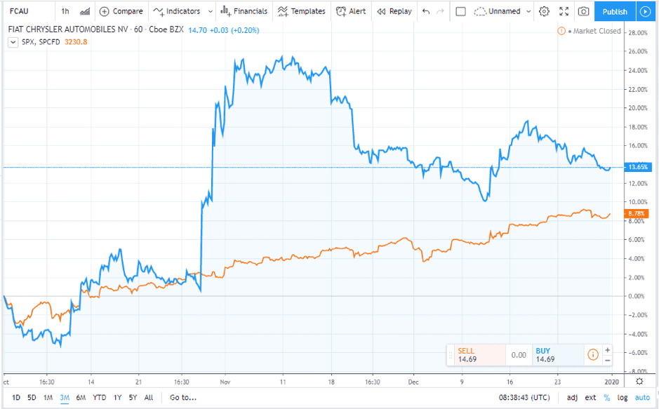 Fiat Chrysler Automobiles (NYSE:FCAU) — Three-month price chart:
