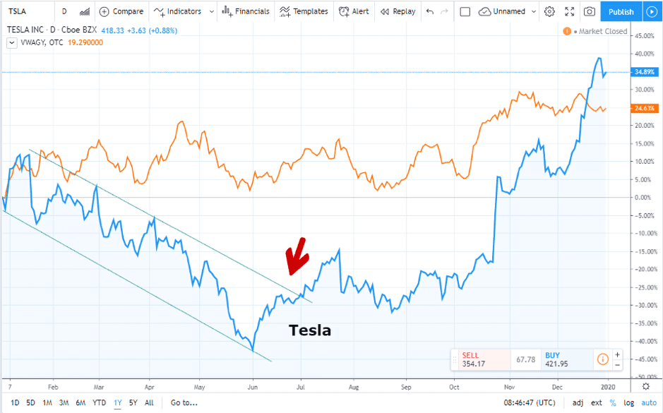 Tesla (NASDAQ:TSLA) vs Volkswagen —One-year price chart: