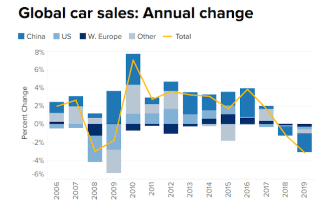 • On Monday, the global sale of new cars was reported to be contracting. In the biggest drop since 2008, total sales for 2019 are forecast to be reduced by 3.1 million.
