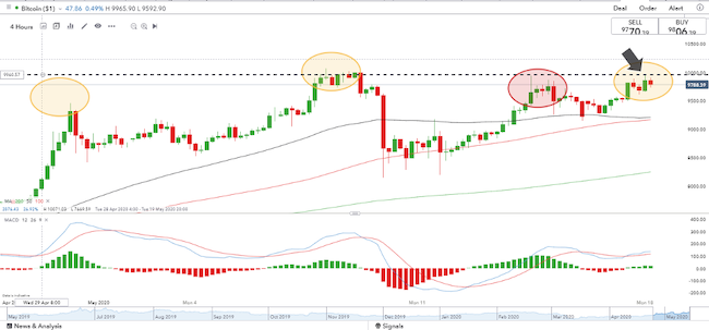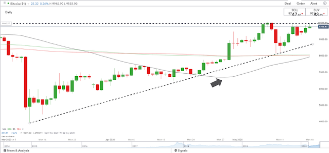 The price of bitcoin has, in just over two months, more than doubled. It has rocketed by 150% from 3,908 to 9,752. The anticipation of the ‘halving,’ which occurred on the 11th of May, has been explained as the catalyst for the price increase. The question of ‘what happens now?’ has so far not been adequately answered. Recent price moves suggest that it could be the bulls who are about to come out on top. Cross-referencing to historical price movements and other asset markets suggests a long position entry level is forming.