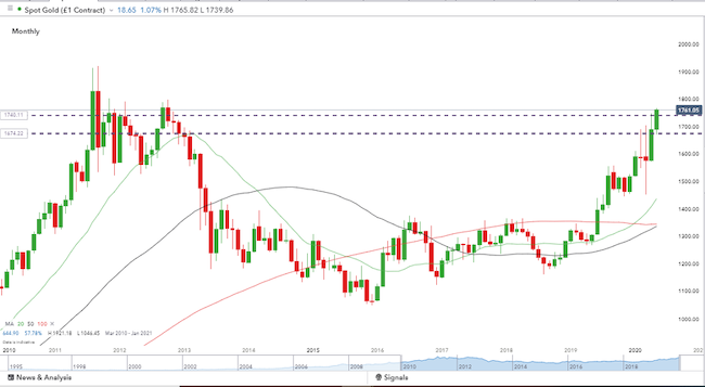 Gold’s break to the upside has been dramatic. Taking the metal as a leading indicator for BTC prices gives hope to the bulls. Also, posting multi-year highs will mean the metal receives more extensive press coverage, and that will generate interest from the retail sector. Bitcoin, by association, could benefit from increased interest in shared features of the two assets. Both can be analysed and traded on the IG platform, and there could be profits for those who think the recent strong price action has more room to run.