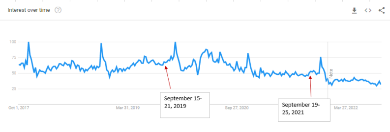 It currently sits at 32, compared to 46 in September 2021 and 63 in September 2019 (a value of 100 represents peak popularity).