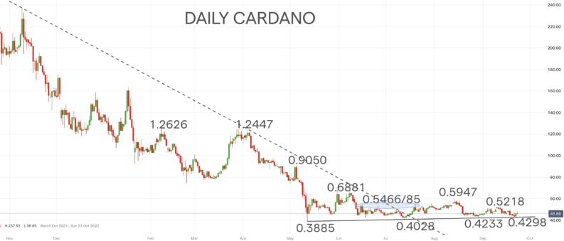 Having twice now rebounded from the above the bear market low of 0.3885 on Thursday 12th May, ADAUSD has once more posted a robust defence of support. As well as the two higher lows in dips down to test support, at 0.4028 in July and again at 0.4233 in late August, Cardano has again posted another higher low in the current setback, holding and rebounding this week from 0.4298. Moreover, the market also defended the sold basing trend line that runs off of the May and July troughs.