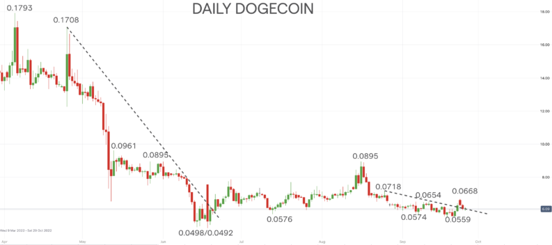 The intermediate-term bottoming effort that has been forming for DOGE from June was challenged by both the early and more latter September tests to mid-July support at 0.0576, then to the early September low at 0.0574, with last week’s push down to 0.0559. However, the recent rebound from 0.0559 up to 0.0668 saw a push up through both the 0.0654 swing resistance and also the tentative downtrend line from latter August.