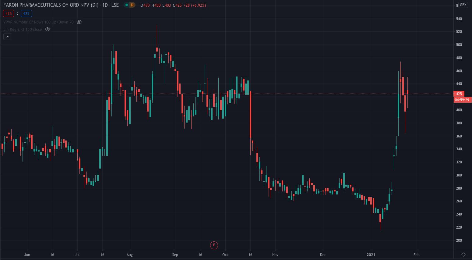 Faron stock price is trading 6.92% higher on the day at 425p per share after initially reaching highs off 450p.