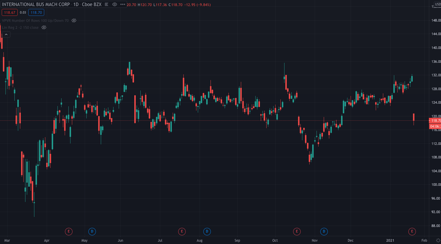 IBM’s stock price fell as low as $117.37 per share after the open and is currently down 10.24% at $118.20, levels not seen since November 2020.