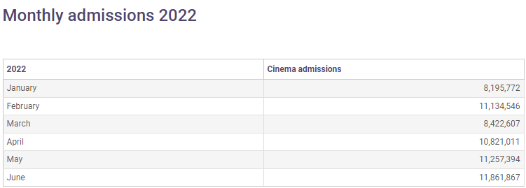 UK Cinema Association data shows admissions grew from 8.1 million in January to 11.8 million in June. In comparison, January 2019 admissions were 13.7 million, and June 2019 admissions were 13.9 million, so there is still some catching up to do.