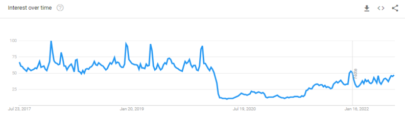 While not yet at pre-pandemic levels, Google Trends shows worldwide cinema searches are climbing since their pandemic plunge. At the same time, Cineworld’s UK website traffic is also close to pre-pandemic levels, hitting around 4.3 million per month on average, according to Semrush.