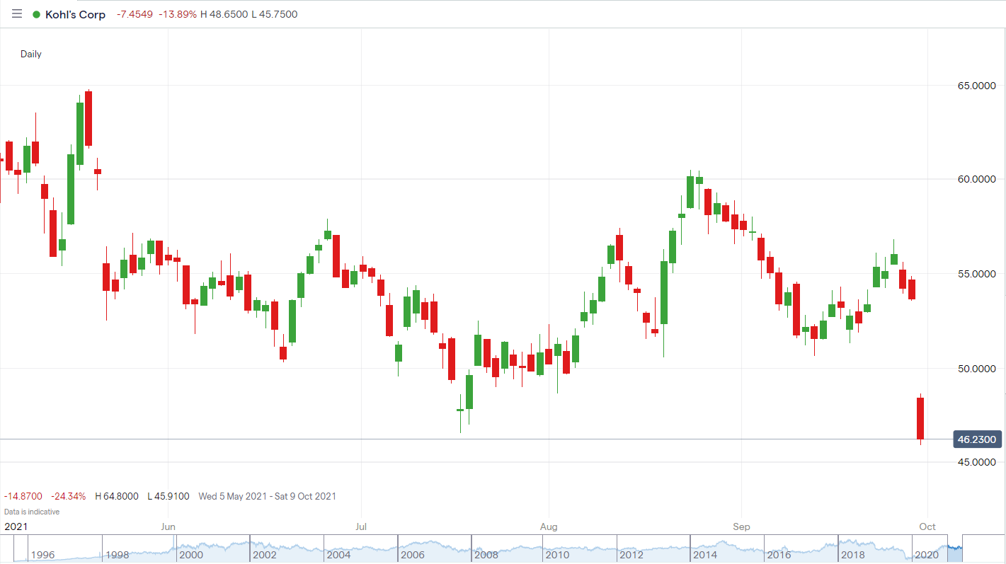 Kohl’s Corp (NYSE: KSS) plunged around 13.3% today, dropping to lows of $46.49 at the time of writing. The plunge came after analysts sliced two notches of Kohl’s rating in the thick of widespread supply chain issues.
