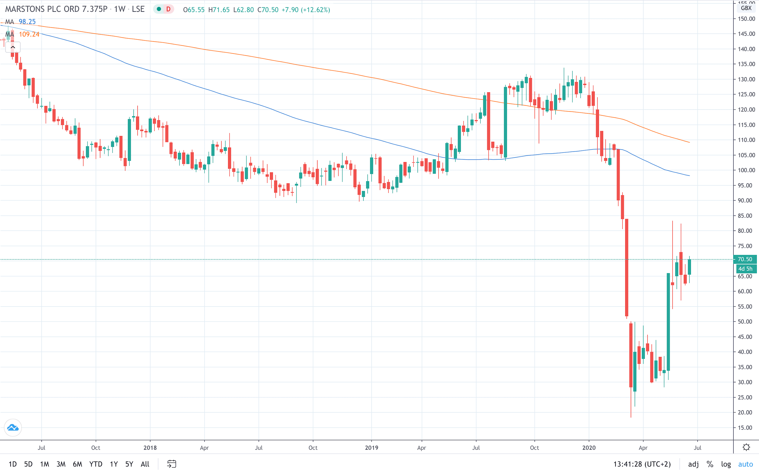 Marstons share price lost over 80% of its value in March on the coronavirus-market selloff. Shares recovered sharply in the last week of May when it was announced that Carlsberg UK and Marstons agreed to create Carlsberg Marston’s Brewing Company, valued at 780 million pounds.