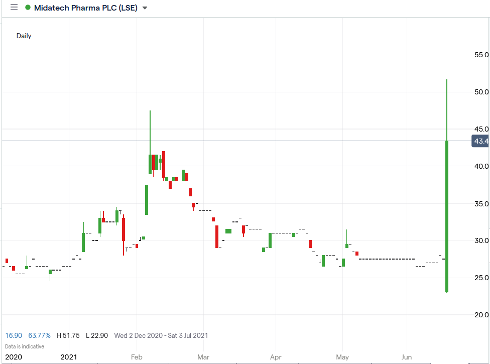 Midatech Pharma shares spiked 88.18% higher to trade at 51.75p, rising from Wednesday’s closing price of 27.50p.