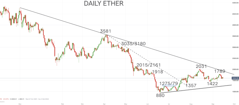 However, the solid rally from late August from 1422 up to 1789 rejected a test of the July swing support at 1357 and held above the basing up trend line from the June bear market low at 880. This leaves the intermediate-term basing theme intact, and in the short-term, whilst holding above 1422, we see the risk for the second half of September skewed to the upside for a retest of the 1789 peak.