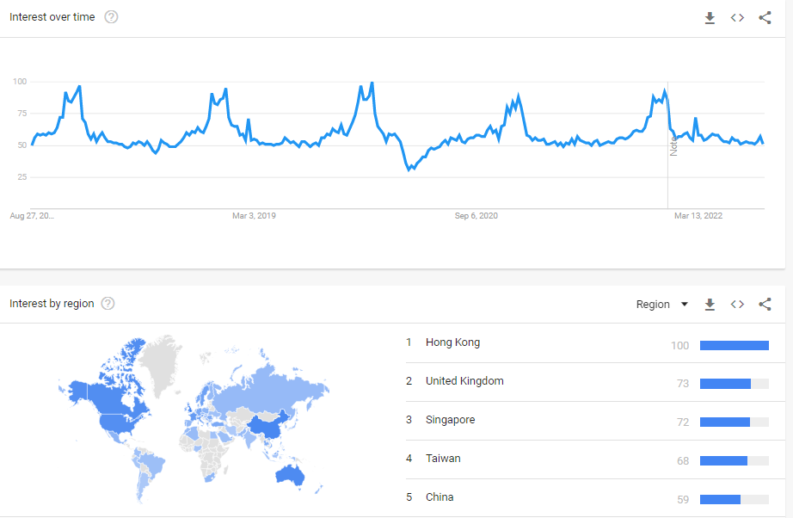 When we look at Google Trends data over the last five years, we can see it has been fairly steady. One thing to note is that China is number five on the list of top five regions, while Hong Kong is top.