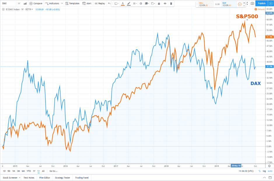S&P 500 Index (OANDA: SPX500USD) vs DAX Index (XETR: DAX) – Five-year price chart 2014-2019