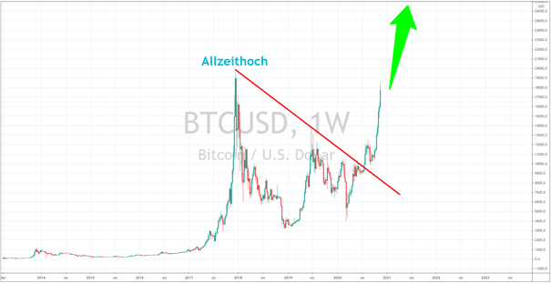 Aus charttechnischer Sicht wirkt derzeit das Allzeithoch wie ein Magnet auf dem Bitcoin. Im Chart erkennt man auch sehr schön, wie es der Crypto Coin gelungen ist, die rote Abwärts-Trendgerade zu überwinden. Seither setzt sich der Aufwärtstrend nach der längeren Korrekturphase fort.