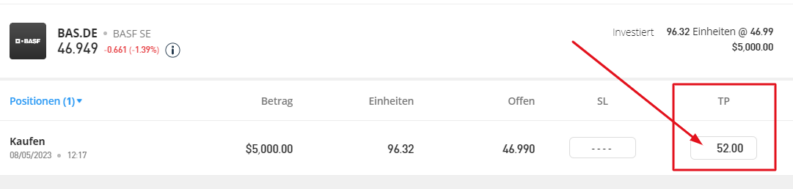 Anstatt ganz rechts auf Schließen zu klicken, wählen Sie nun die Zahl oder das Feld unterhalb von „TP“ aus (Take Profit).