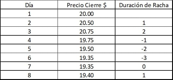 Se emplean números posititvos para representar valores de cierre hacia arriba, y se usan números negativos para representar valores de cierre a la baja. Si el activo cierra al mismo tiempo (sin cambio) durante intervalos de gráfico consecutivos, el Largo Arriba/Abajo es 0.
