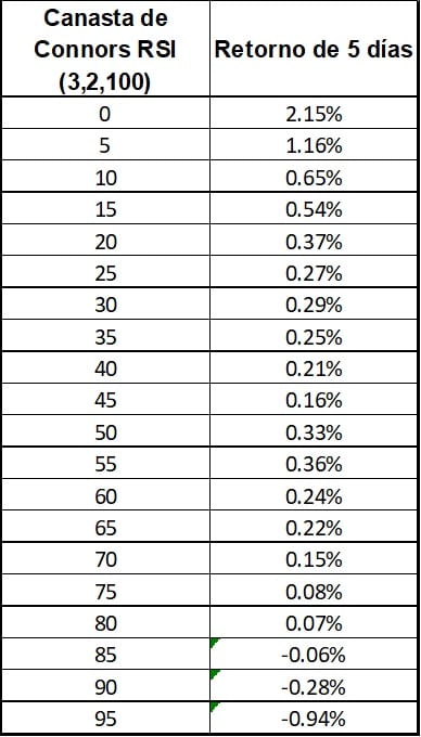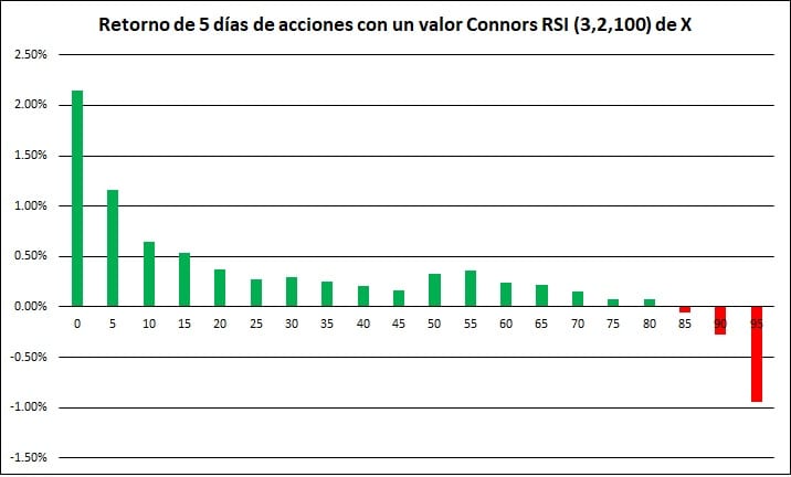 Cuando el valor de Connors RSI cae por debajo de 20, podemos ver que los retornos promedio del mercado durante los siguientes cinco días comienzan a aumentar sustancialmente. Las acciones que caen en la cesta 0 (con una lectura de indicador CRSI de 0 a 5) experimentaron ganancias de precio promedio de 2.15% durante las siguientes cinco sesiones de operaciones.