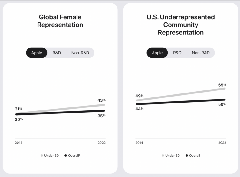 According to the most recent data, the number of employees from underrepresented communities (URCs) increased by 64%. That’s 18,000 people and jobs and URC staff now make up nearly 50% of Apple’s American workforce.