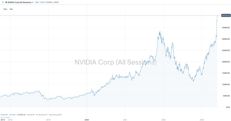 The good news for Nvidia shareholders is that the firm’s prominent position in the gaming world is complemented by a move into AI. Once again, the company appears to have spotted a new trend early, with global spending on AI expected to increase by around 20% annually and approaching $110 billion by 2024. The moves into cloud-based subscription software and services is also likely to result in promising revenue streams.
