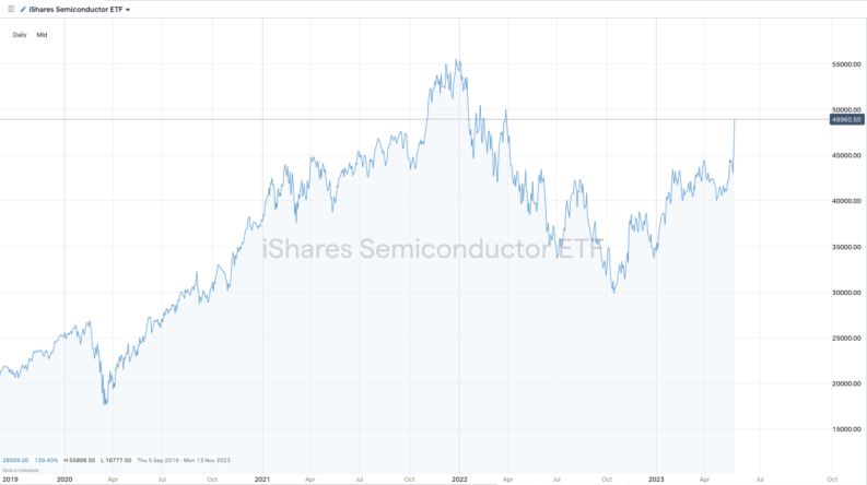 The iShares Semiconductor ETF typically holds 30 different semiconductor stocks and only targets US-based firms. It provides exposure to the entire life cycle of the chip-making process, with designers, manufacturers and distributors of chips all eligible for a place in the fund.
