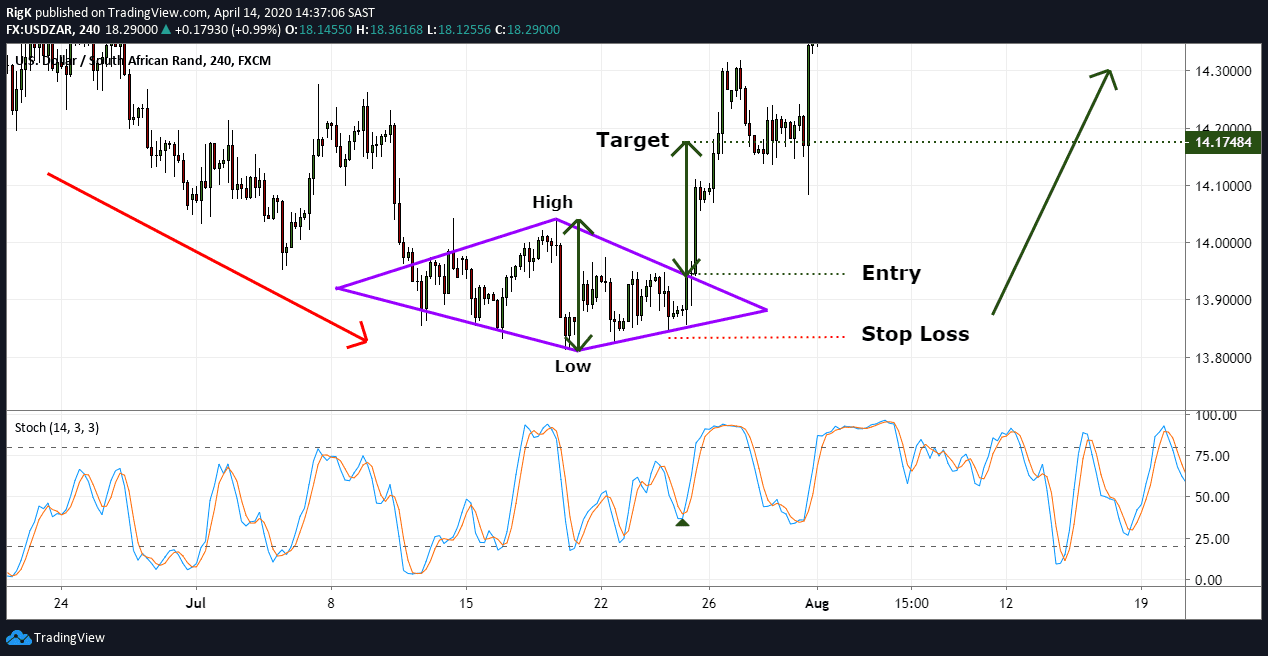 Important: Your risk versus your reward potential is one of the most important factors to consider as a trader. The chart above shows that it was also possible to place an initial target at the high of the diamond pattern after the breakout, with a stop loss below the previous higher low.