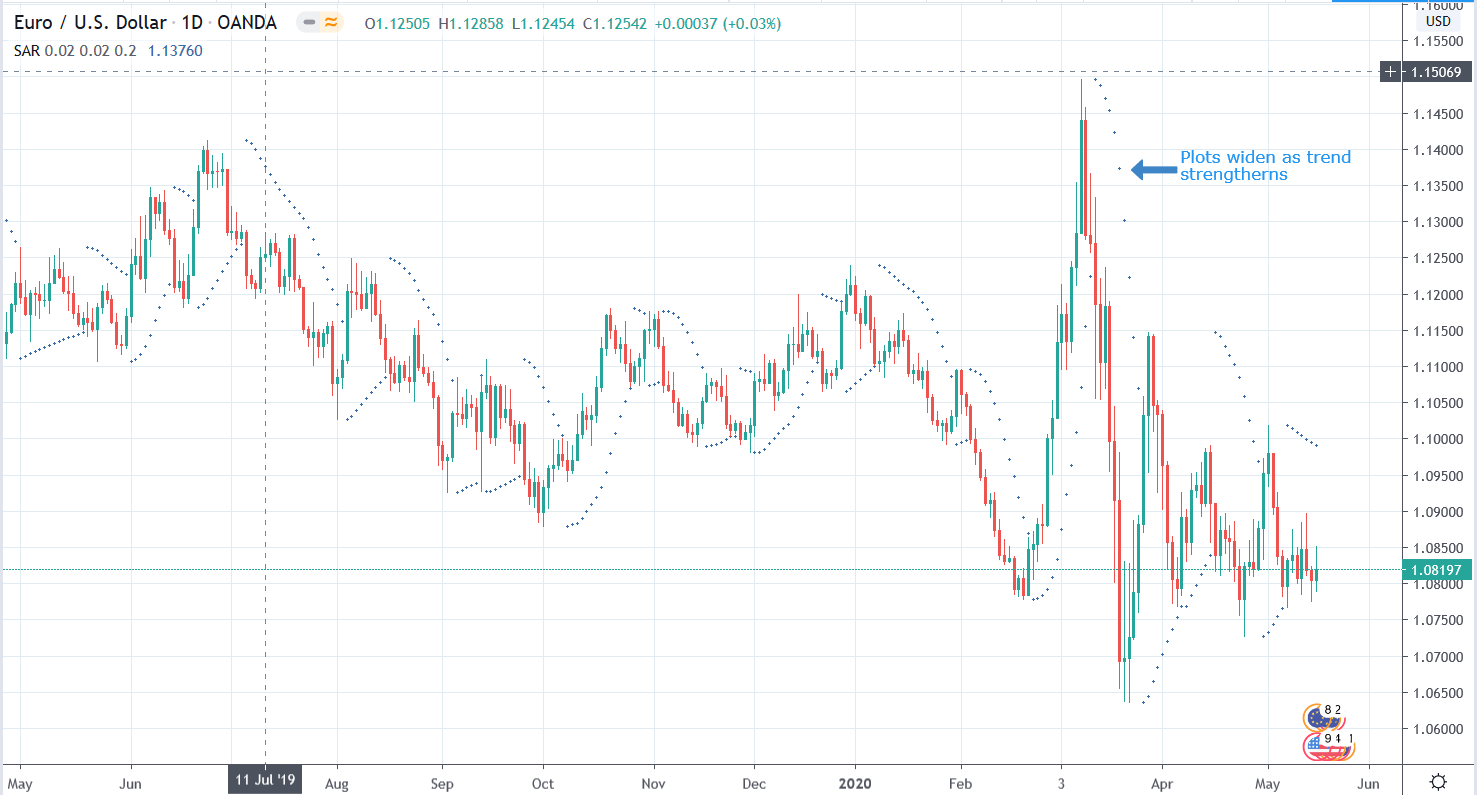 If the dots are below the current price action, this indicates that price is in a bullish trend. Alternatively, if the dots are above the current price action, then this shows a bearish trend.