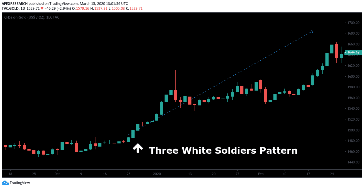 Essentially, Three White Soldiers patterns create an early signal that sellers have left the market and that an emerging uptrend might be forming in its earliest stages. Following is a live chart example of the Three White Soldiers pattern on the price history of gold. In this example, the price of gold trades in a sideways range for an extended period of time. The initial breakout of this trading range exploded in three large bullish candles that cleared prior resistance levels. In the months that followed, gold markets experienced a substantial rally that generated superior profits for technical analysis traders with long positions.