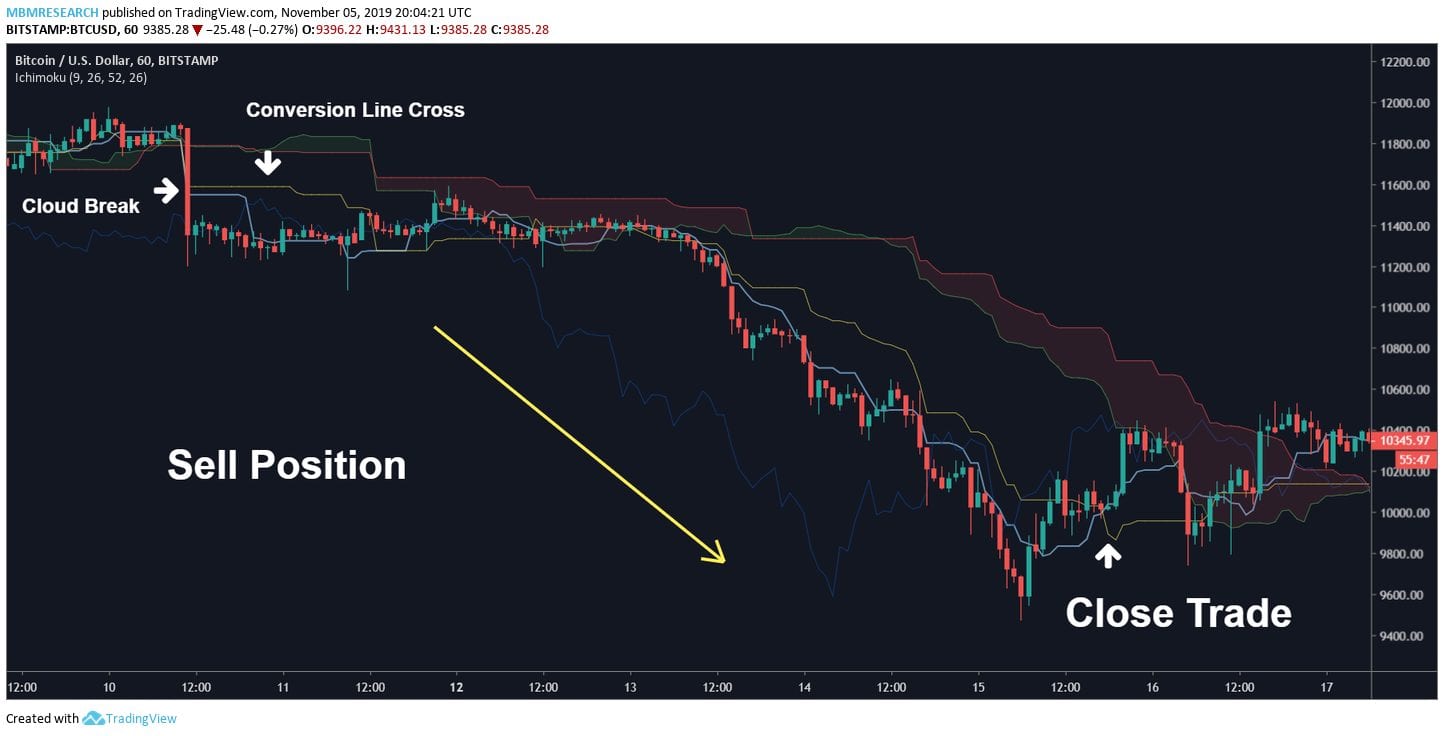 In the second real-time trade example, we can see a bearish scenario that would help us to establish short positions.  Bitcoin breaks below the Ichimoku Cloud $11,560 and the Conversion Line crosses below the Base Line on the hourly charts.