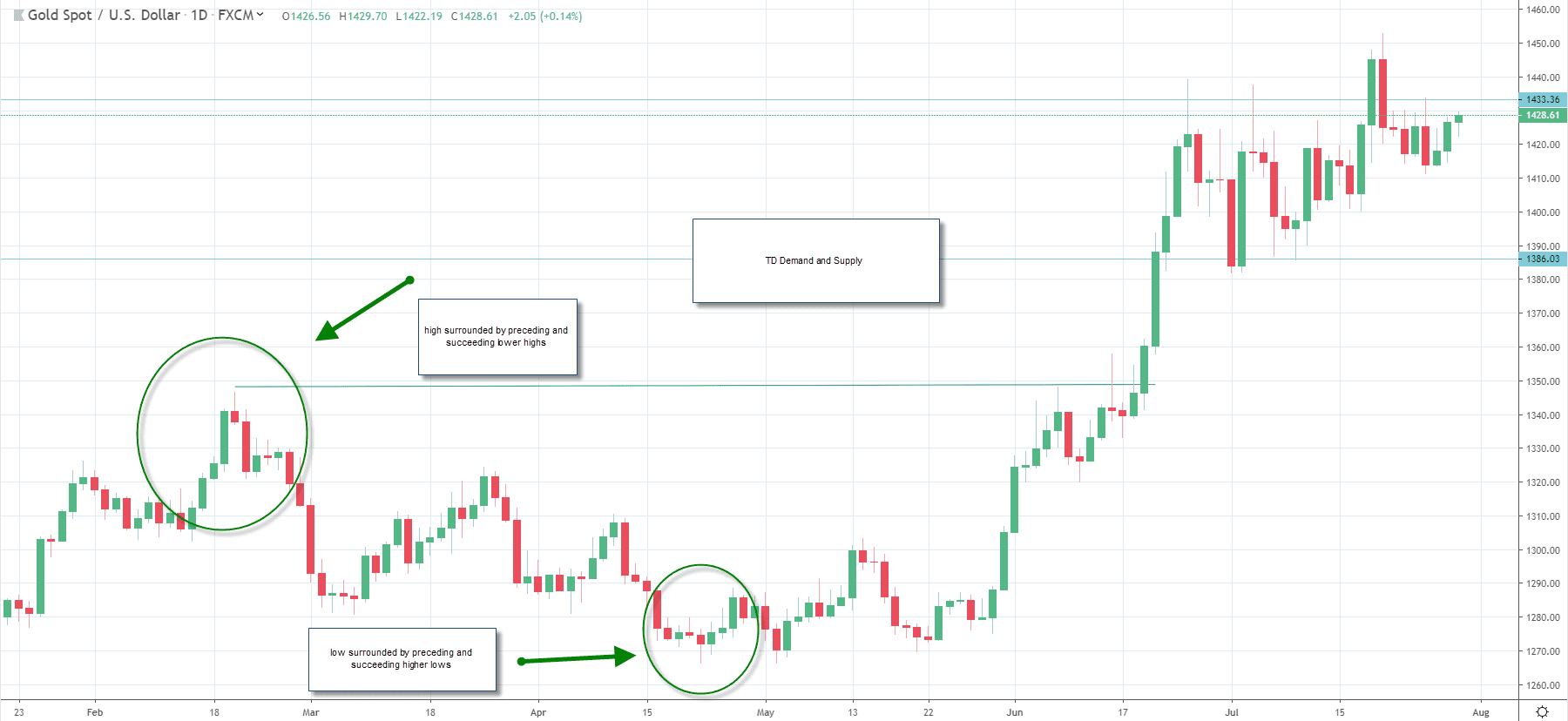 Thomas DeMark wrestled with the idea of how to create an objective trend line based on supply and demand. He concluded that you could find strong support when you found a low point that was surrounded by multiple higher lows in the period preceding and succeeding the TD demand point.