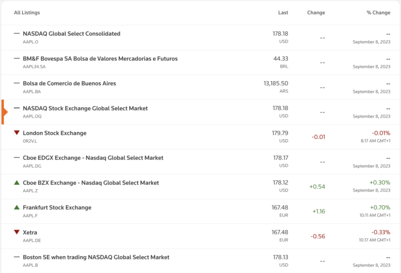 To satisfy demand from international investors, Apple shares can be purchased by most via various different brokerages globally. However, it is also listed on other exchanges, as seen below.